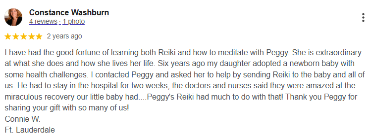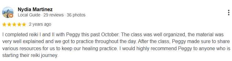 Peggy is one of 43 Licensed Reiki Master Teachers in the United States. She has been teaching Reiki classes since 2010.